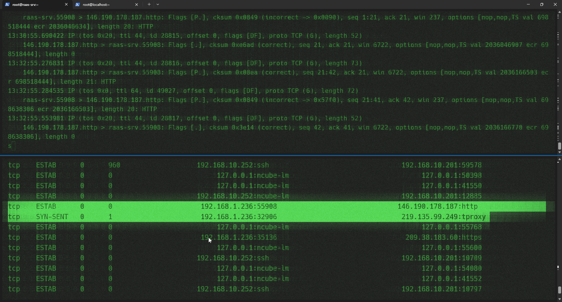 4026531956 9748ce91 1972 2046 15 0x8bae39542e80 AF_INET STREAM TCP 192.168.1.236 35136 209.38.183.60 443 ESTABLISHED -