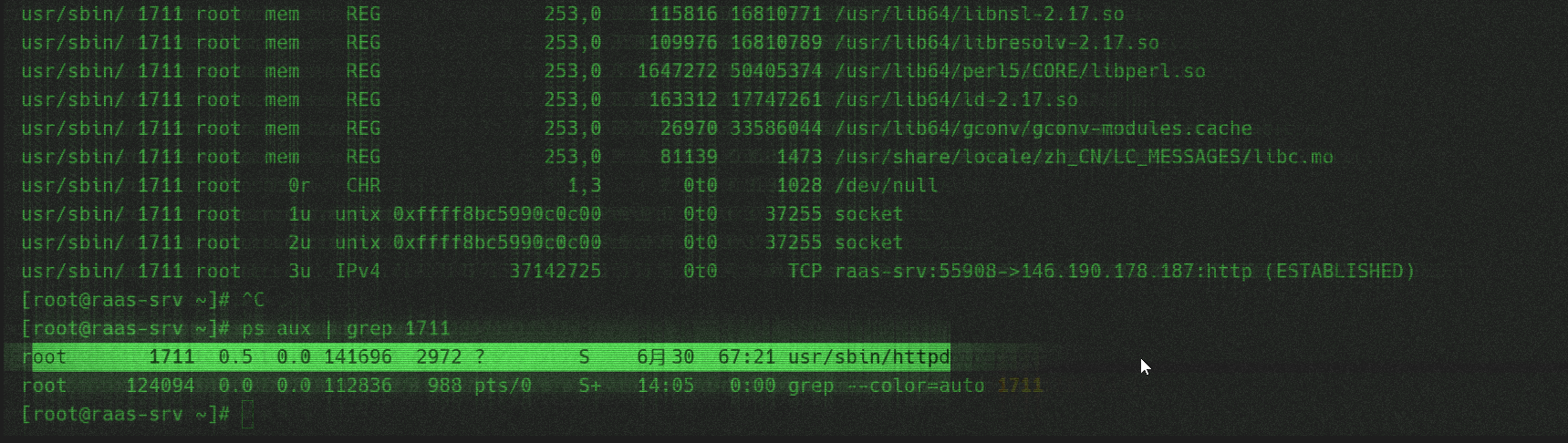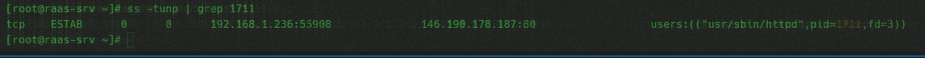 4026531956 usr/sbin/httpd 1711 1711 3 0x8bae395464c0 AF_INET STREAM TCP 192.168.1.236 55908 146.190.178.187 80 ESTABLISHED -