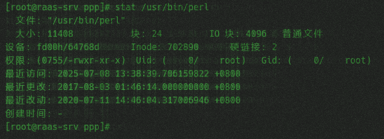 - 检查perl的二进制文件,并没有发现异常,应该是通过perl脚本启动的,但是未能找到perl脚本
