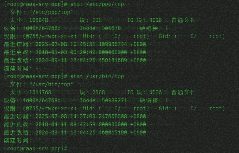 - 通过从正常服务器查/usr/bin/top查到MD5为443b256b2ed0195c5de32319cc9593f6,原top被挪到了/etc/ppp,/usr/bin/top是被修改过